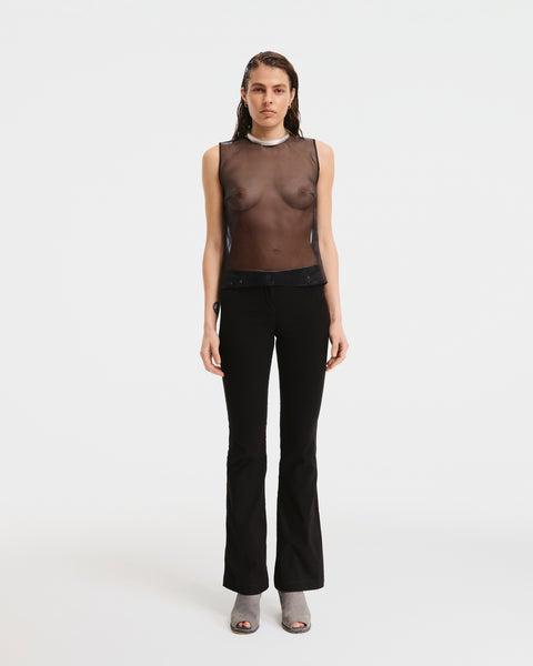 Low-waist skinny pants with a body-contouring fit and a controlled flare at the hem. Constructed to sit low on the waist and follow the natural line of the hips and legs without losing structure. Finished with minimal metal hardware, aligned with Lezo brand code. Best paired with Clamp Jacket.