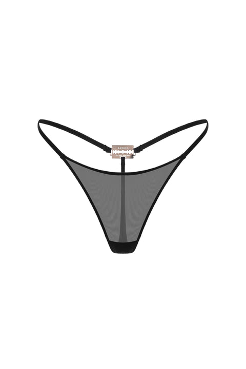 Created as a symbol of control and seduction, the Talisman G-String transforms intimacy into a source of power. Each adjustable strap follows the geometry of natural curves, contouring the body with its translucent mesh material. A soft cotton gusset provides breathability and comfort, blending seamlessly into the design.The central element is a cold metal clasp in the shape of a blade. It is a subtle reflection of quiet confidence, danger, and grace.