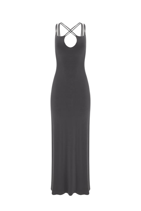 Sculptural floor-length dress is made of a fluid micro oil jersey. The intertwined straps on the chest diverge across the back, creating an elegant geometric pattern.The double-layer construction adds depth and structure while preserving the fabric’s light, liquid movement.