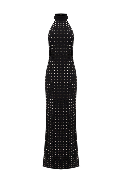Void dress embodies sharp minimalism with a sculptural presence. Designed as a unisex model, its straight silhouette falls to the floor, blurring the lines between masculine and feminine codes. Accented with a precise pattern of holiness in matte antique silver, the dress softens the shine to a muted glow. The open back and high side slits emphasise magnetic seduction, while the neckline adds a sense of precision.